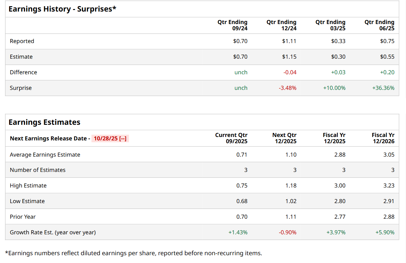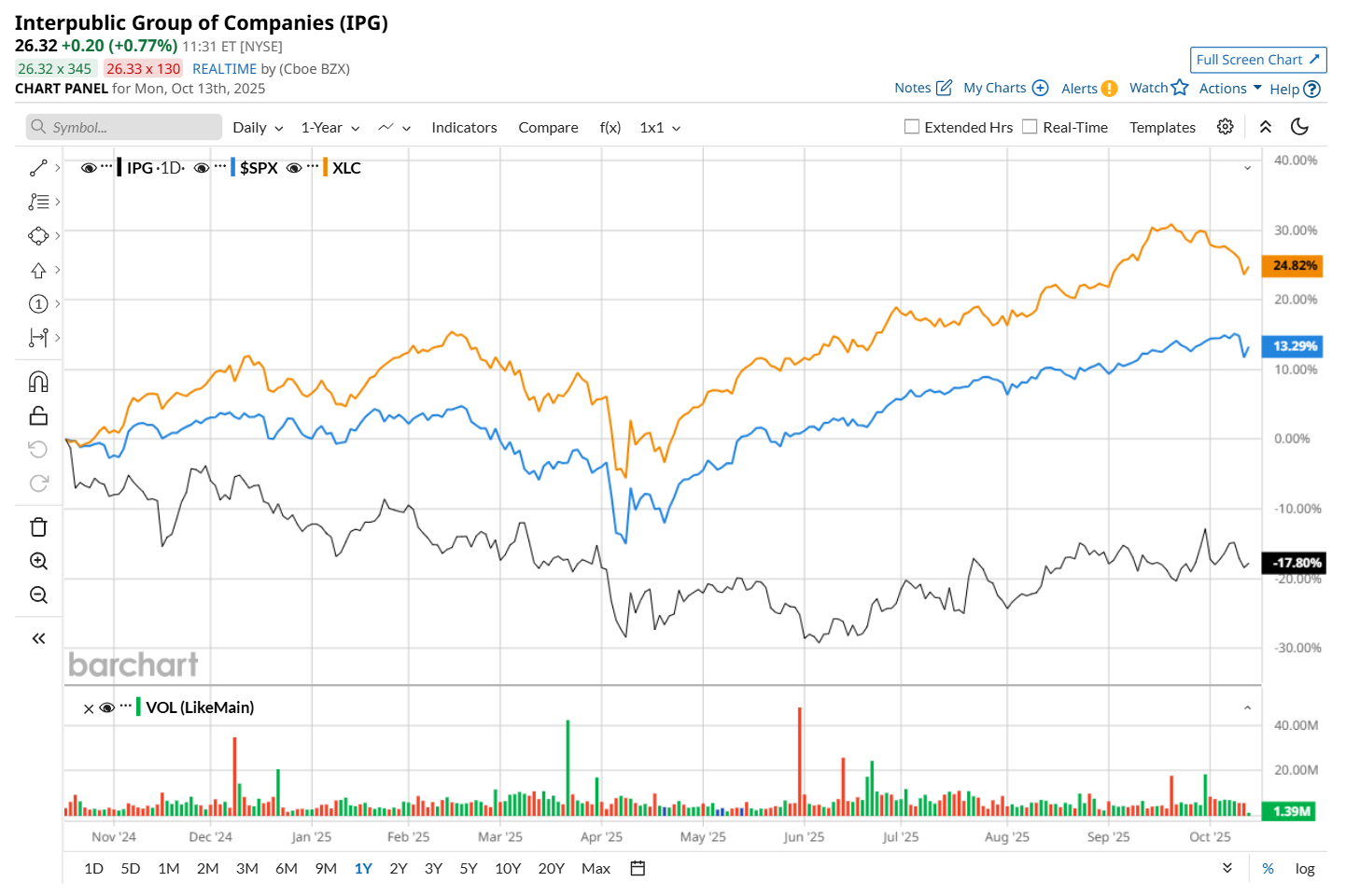 What to Expect From Interpublic Group's Next Quarterly Earnings Report![]() New York-based The Interpublic Group of Companies, Inc. (IPG) provides advertising and marketing services. Valued at a market cap of $9.6 billion, the company delivers a wide range of services, including advertising, creative development, media planning & buying, public relations, digital marketing, data & analytics, experiential marketing, health & wellness communications, and brand consulting. It is scheduled to announce its fiscal Q3 earnings for 2025 in the near future. Ahead of this event, analysts expect this advertising and marketing services provider to report a profit of $0.71 per share, up 1.4% from $0.70 per share in the year-ago quarter. The company has met or surpassed Wall Street’s bottom-line estimates in three of the last four quarters, while missing on another occasion. In Q2, IPG’s EPS of $0.75 exceeded the forecasted figure by a notable margin of 36.4% For the current fiscal year, ending in December, analysts expect IPG to report a profit of $2.88 per share, up 4% from $2.77 per share in fiscal 2024. Furthermore, its EPS is expected to grow 5.9% year-over-year to $3.05 in fiscal 2026. ![]() IPG has declined 16.1% over the past 52 weeks, considerably lagging behind both the S&P 500 Index's ($SPX) 14.3% return and the Communication Services Select Sector SPDR Fund’s (XLC) 26% uptick over the same time frame. ![]() On Jul. 22, shares of IPG soared almost 7% after its Q2 earnings release. The company reported total revenue of $2.5 billion, down 6.4% year-over-year, primarily due to lower organic revenue tied to prior-year client account activity. Despite the revenue decline, IPG delivered strong adjusted margins, reflecting solid progress in its strategic transformation program and improved operating performance across its two largest business units. Its adjusted EBITA (before restructuring charges and deal costs) rose 16.2% from the year-ago period to $393.7 million, while its adjusted EPS of $0.75 beat analyst estimates by an impressive 36.4%. Looking ahead, IPG expects to achieve an adjusted EBITA margin for fiscal 2025 significantly above the previously guided 16.6%, signaling continued momentum in profitability. Wall Street analysts are moderately optimistic about IPG’s stock, with a "Moderate Buy" rating overall. Among nine analysts covering the stock, four recommend "Strong Buy," and five suggest "Hold.” The mean price target for IPG is $31.16, implying an 18.5% potential upside from the current levels. On the date of publication, Neharika Jain did not have (either directly or indirectly) positions in any of the securities mentioned in this article. All information and data in this article is solely for informational purposes. For more information please view the Barchart Disclosure Policy here. |